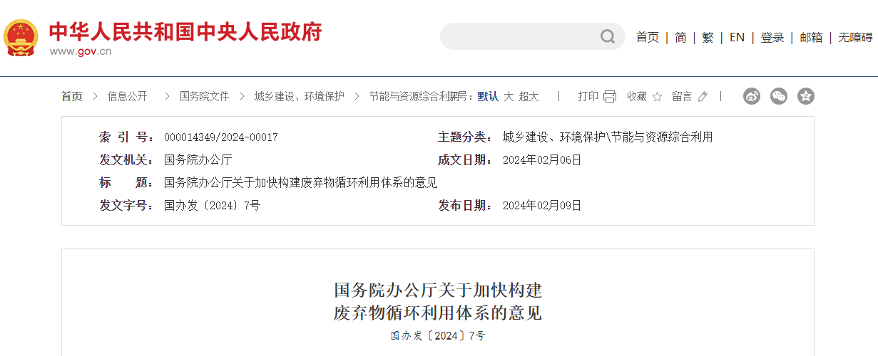 國(guó)務(wù)院辦公廳關(guān)于加快構(gòu)建廢棄物循環(huán)利用體系的意見(jiàn)